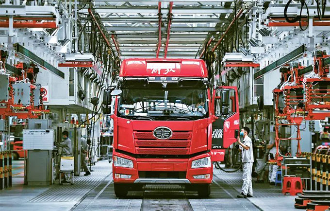 企業(yè)強則國家強,加快建設(shè)世界一流企業(yè)是全面建設(shè)社會主義現(xiàn)代化國家的重大任務,是新時代國有企業(yè)的戰(zhàn)略目標。近來,一汽解放集團股份有限公司生產(chǎn)按下“加速鍵”。圖為2022年6月15日,工人在位于吉林長春的一汽解放總裝車間內(nèi)裝配車輛。 新華社記者 許暢/攝